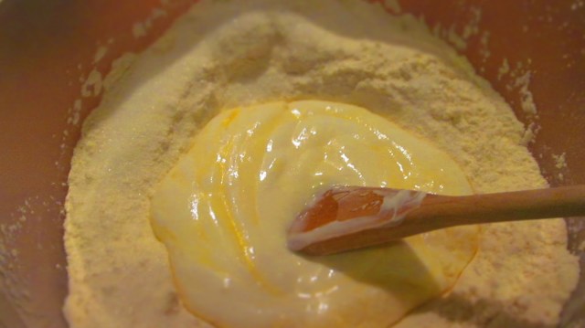 - В кладенчето слагам разбитото яйце, киселото мляко с разтворената в него сода и олиото.