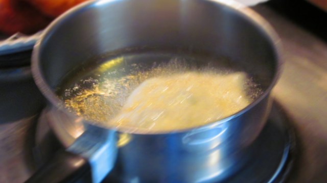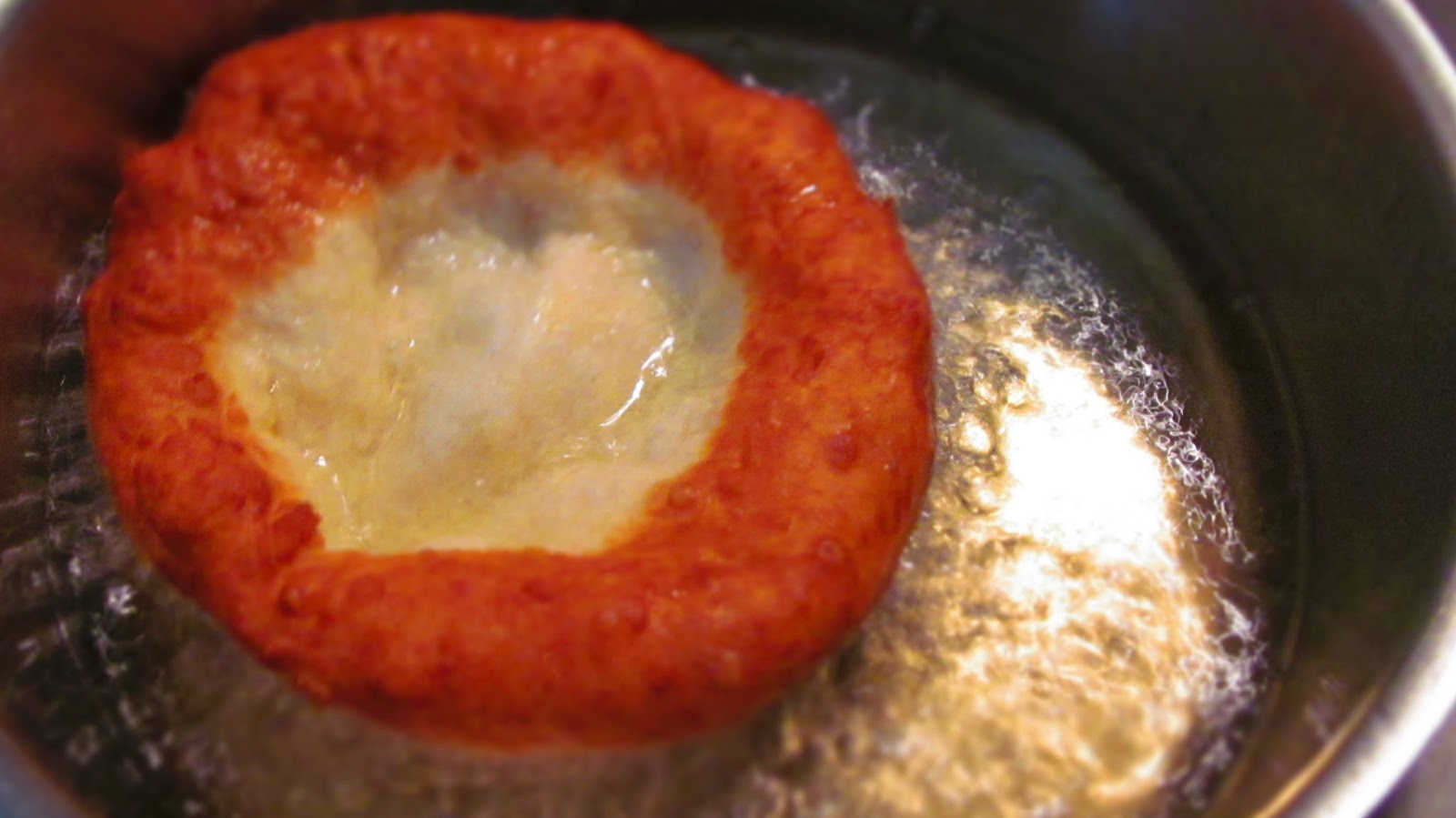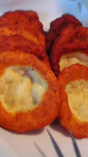 - Пускам готовата мекица в горещото олио и тук е хубаво, ако нямате много опит, някой да Ви помага в обръщането на мекиците, което аз правя с вилица с дълга дръжка. Самото изпържване на мекицата е много бързо и е наложително някой да я обърне бързо, докато Вие приготвяте следващата бройка.