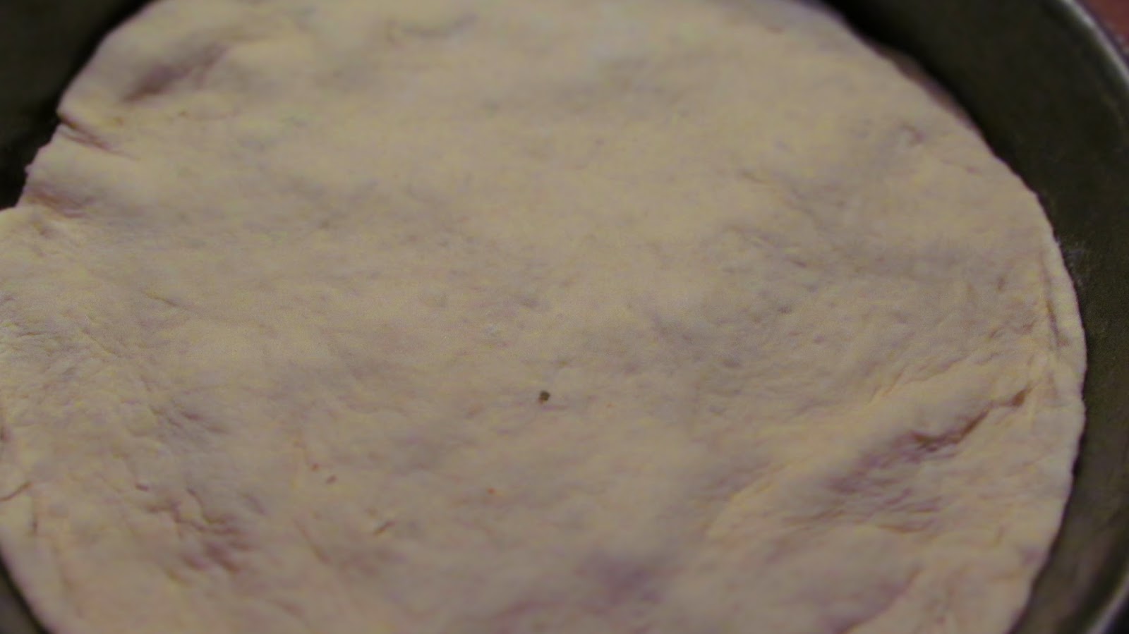 - От първата топка разточвам кора, която е съвсем малко по-голяма от дъното на формата, слагам в тавичката и съвсем леко задигам краищата на кората по стените на формата.