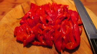 - Изпечените и обелени чушки нарязвам на тънки лентички.
