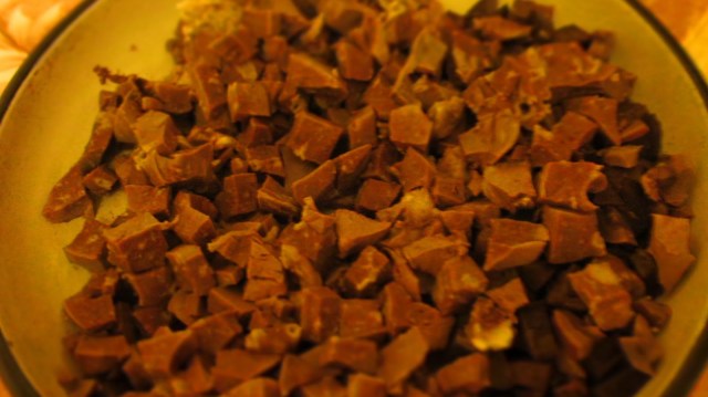 - Изваждам ги от бульона и когато изстинат, нарязвам всичко на възможно най-малките кубчета (около 1 см).