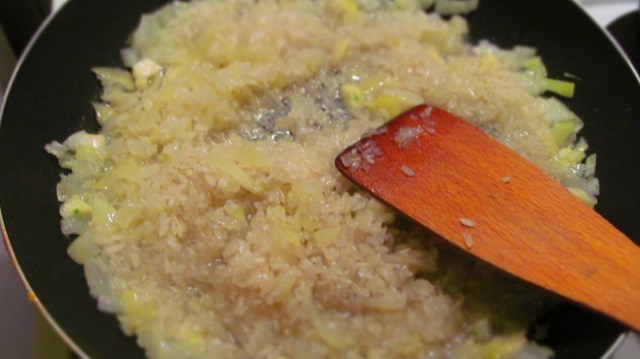 - Добавям ориза, изпържвам до стъклен (или прозрачен), и веднага заливам с две чаени чаши от бульона, в който са врели дреболиите.