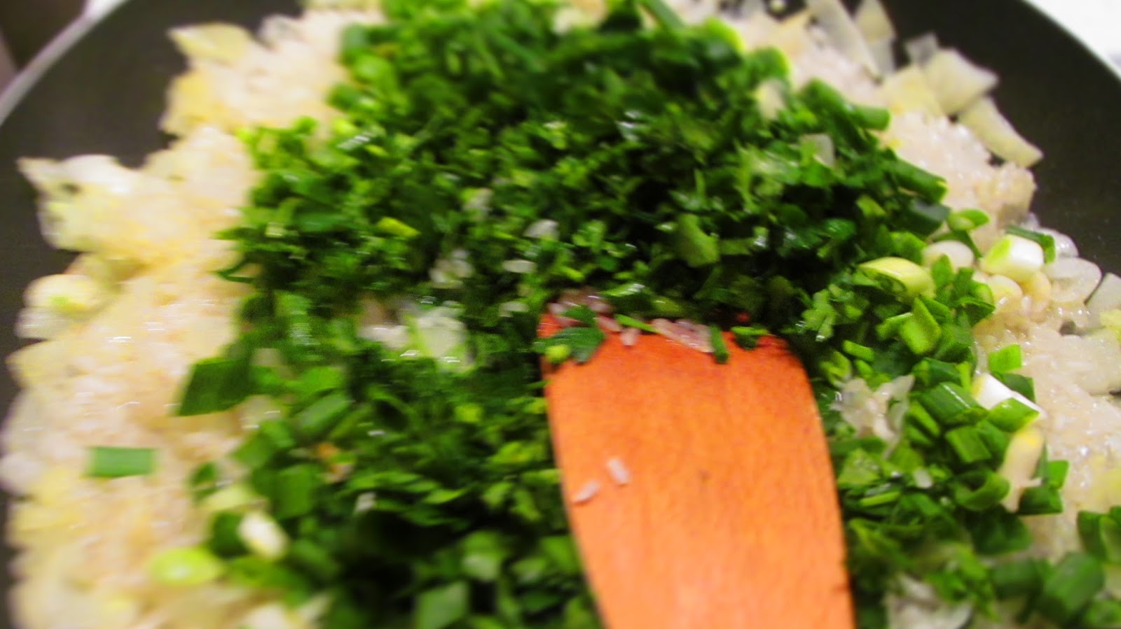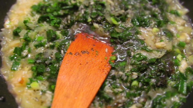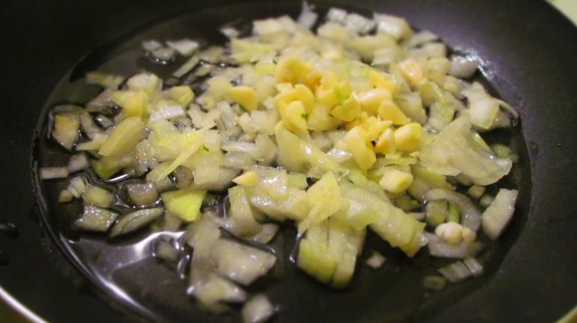 - В тиган изсипвам олиото и в него изпържвам за кратко кромидия лук и скилидките чесън.
