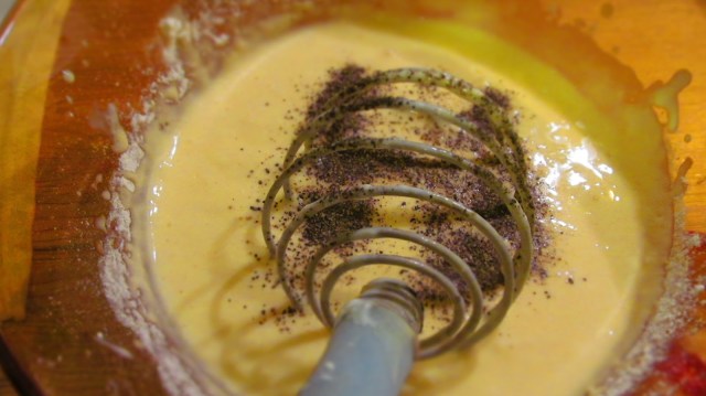 - В голяма купа разбих яйцата с брашното и киселото мляко. Посолих на вкус.