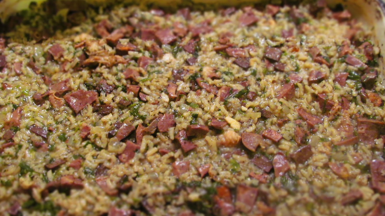 - В подходяща по размер тавичка изсипвам сместа от тигана и нарязаните дреболии и заливам с вода, като при мен съотношението ориз:вода е 1:4 (като приспадам първите две чаши с вода, с които залях ориза в тигана). Аз използвах две чаши ориз и в тавичката добавих още 6 чаши вода.