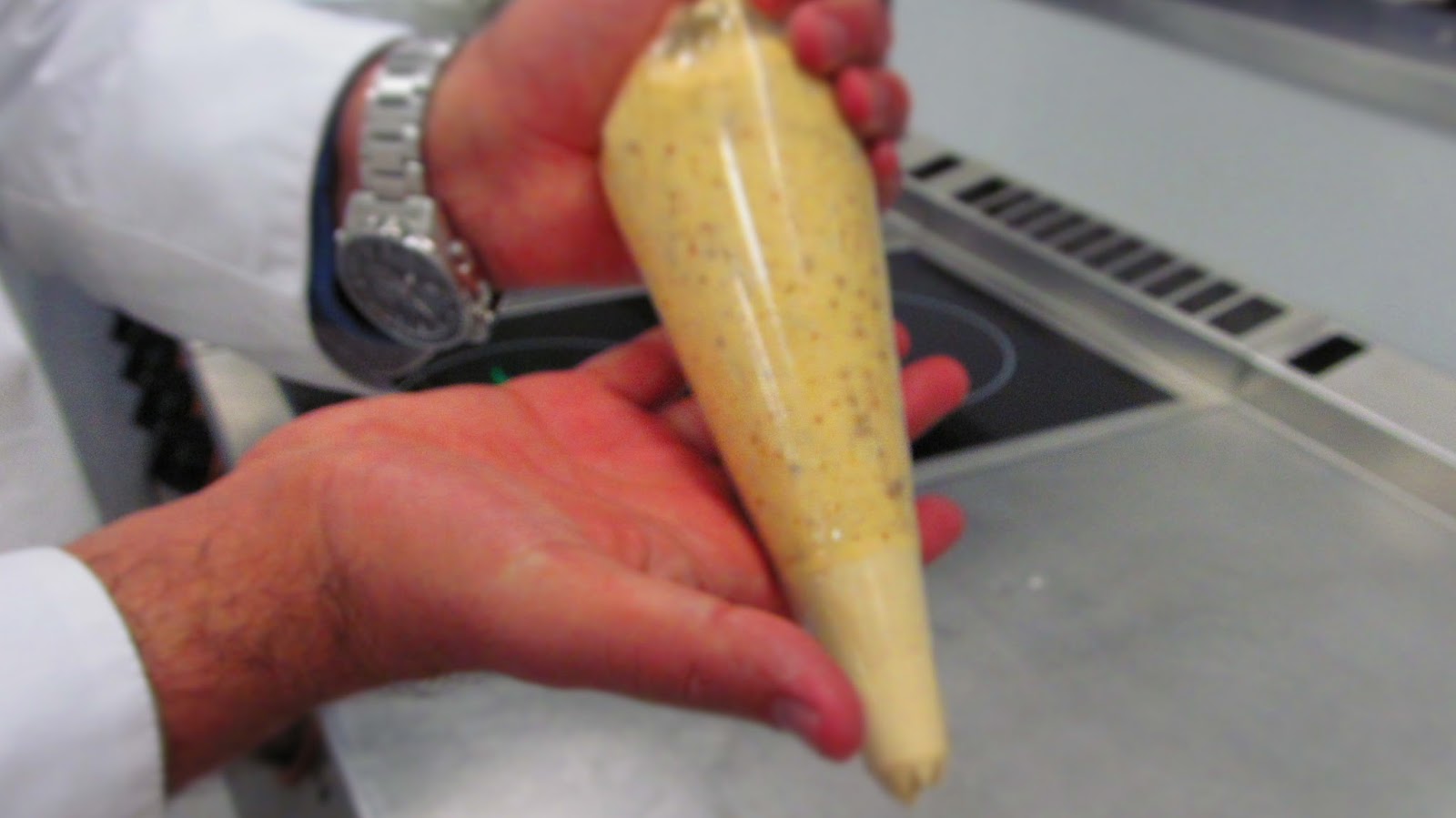 Трюфелите бяха два вида – с дъх на карамел и с дъх на кафе. Карамелените трюфели са приготвят като към ганаша добавяме карамел, а с дъх на кафе – добавяме захарен сироп с нес кафе. Това, което научих за трюфелите е, че ако добавяме алкохол, трябва да става когато сместта е изстинала.