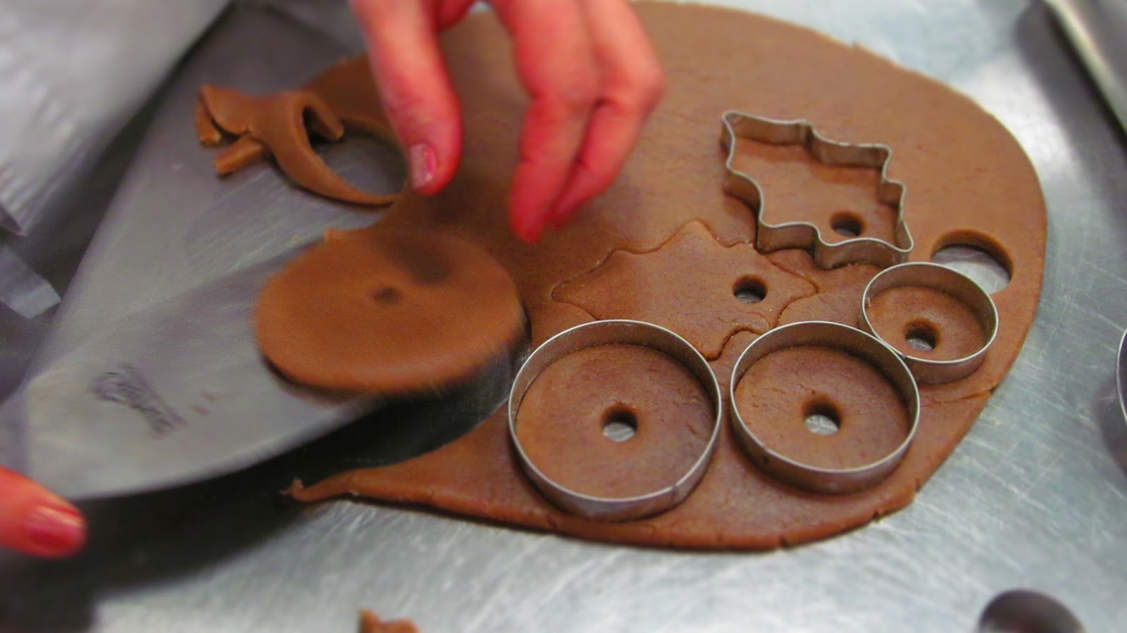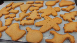 • Отлежалото тесто се разточва на кора с дебелина 7 мм до 1 см. и от нея се изрязват с помощта на формички фигурки, които се подреждат в тава, покрита с домакинска хартия.