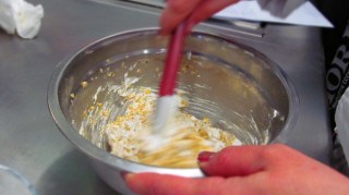 • Когато сместта е изстинала се добавят едно по едно яйцата, като се редуват с добавяне на брашното и подправките. Поуката: брашното трябва да е винаги пресято, за да има въздушност тестото и не се изсипва на един път цялото количество, защото според вида брашно е и нужното количество. Може да остане неусвоено или пък да се наложи добавяне. Разбъркването е непрекъснато с миксер.