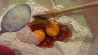 - Направих кладенче и вътре чукнах двете яйца, добавих меда и разтворената в оцета сода.