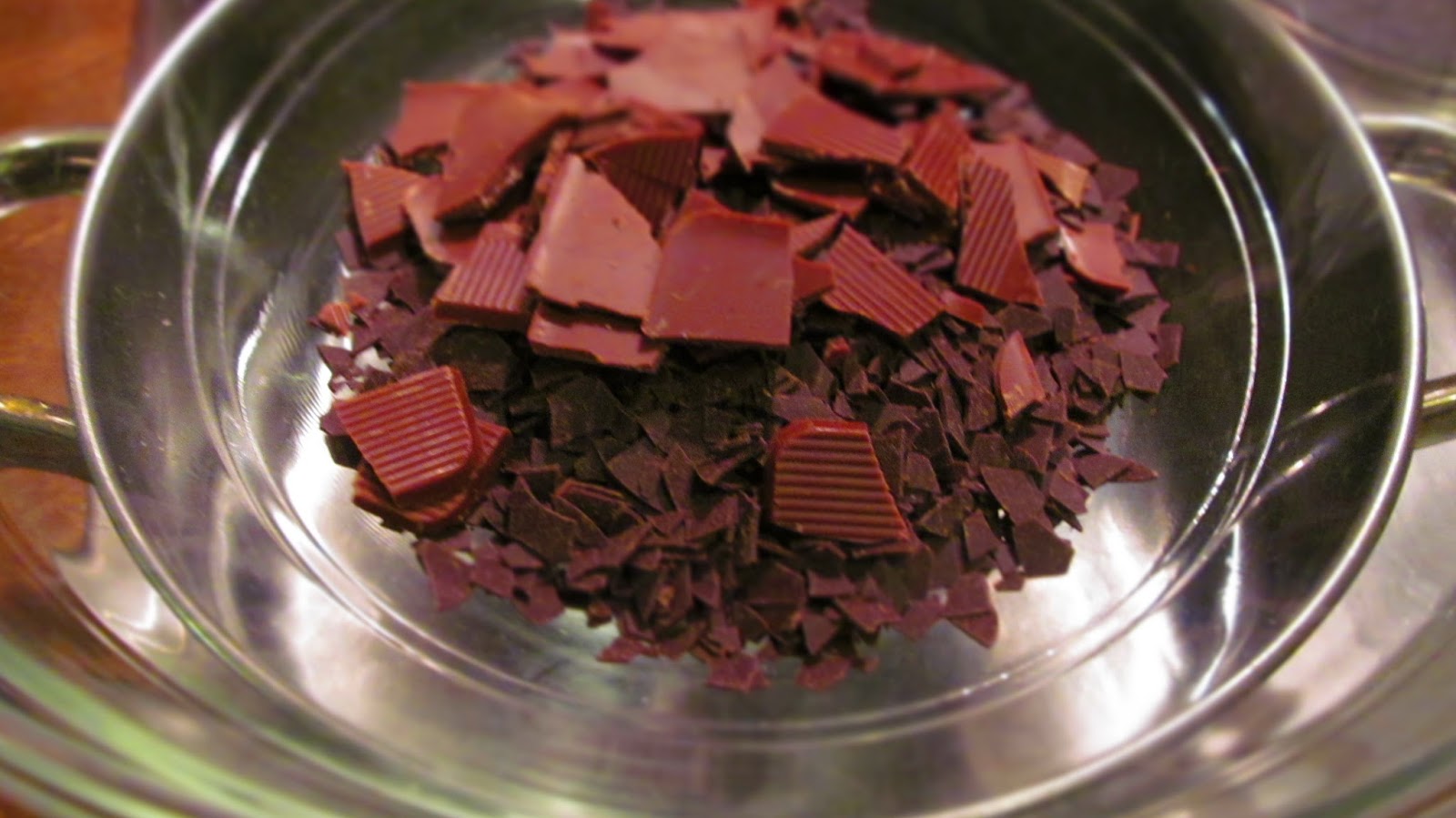 - Разтопих шоколадът, с който разполагах у дома. В последно време използвам голяма стъклена купа за разтопяването, която слагам в тенджера с вода, но така че водата да не опира в дъното на купата.