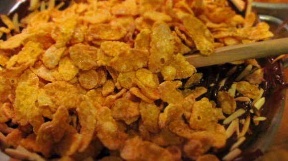 - Изсипвам корн-флейкса в шоколада и разбърквам.