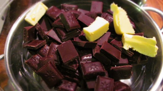 - Разтопяването на шоколада, заедно с маслото правя в голяма купа.