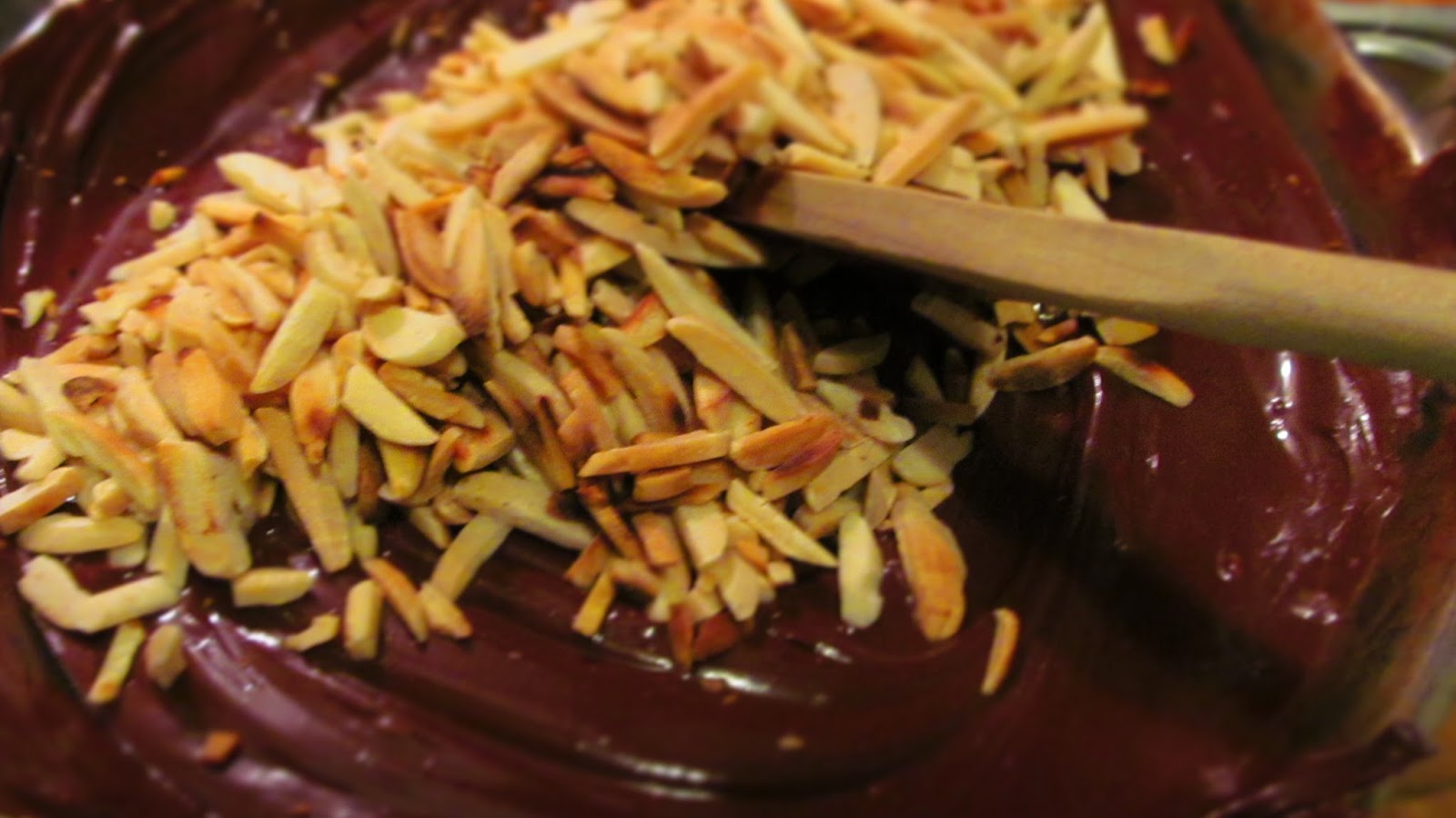 - Готовите бадеми добавям към течния шоколад и разбърквам.