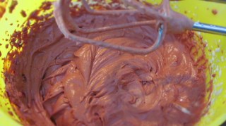 - 3 с. л. от сметаново-шоколадовия крем разбърквам със желатина, за да се уравновесят температурите им и връщам в сметановия крем като разбивам за кратко с миксер.