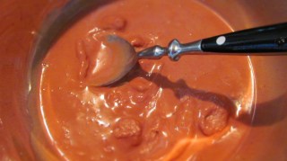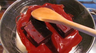 - Разтопявам 125 гр. от шоколада по познатата ни вече технология. Тенджера със студена вода. Върху нея голяма купа, чието дъно не трябва да се опира във водата. Начупвам в нея шоколада. Включвам котлона на максимална степен и когато водата заври, отделям тенджерата от котлона. Бъркам с дървена лъжица и шоколадът е разтопен.