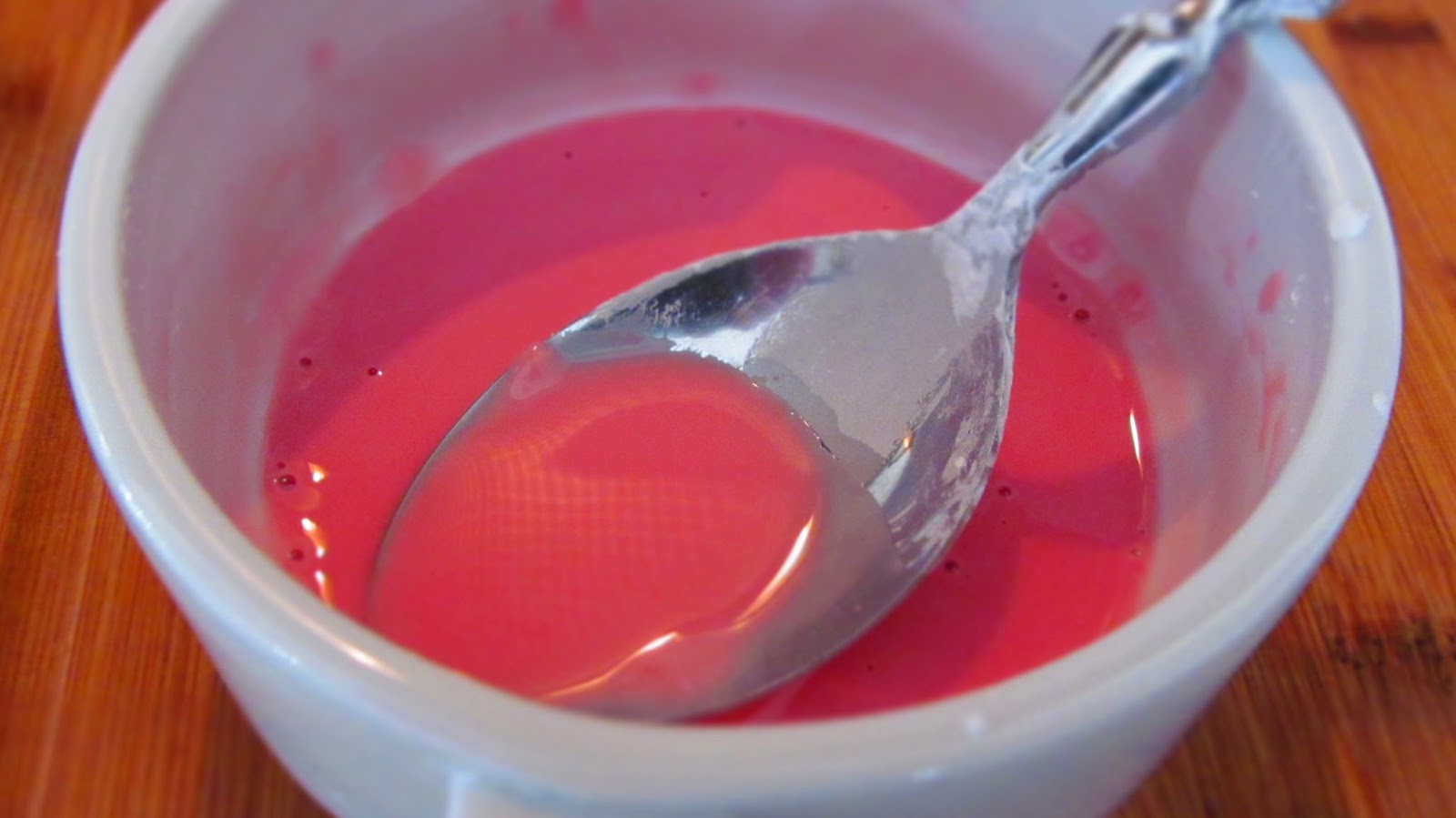 - Листата желатин накисвам в 5 с. л. студена вода. Когато набъбнат изстисквам от водата и загрявам на котлона. Те много бързо стават течни.