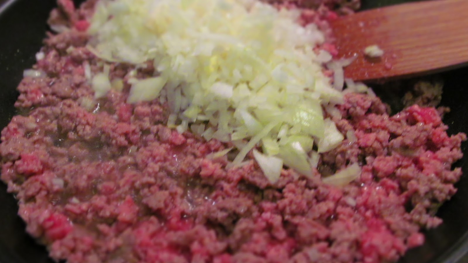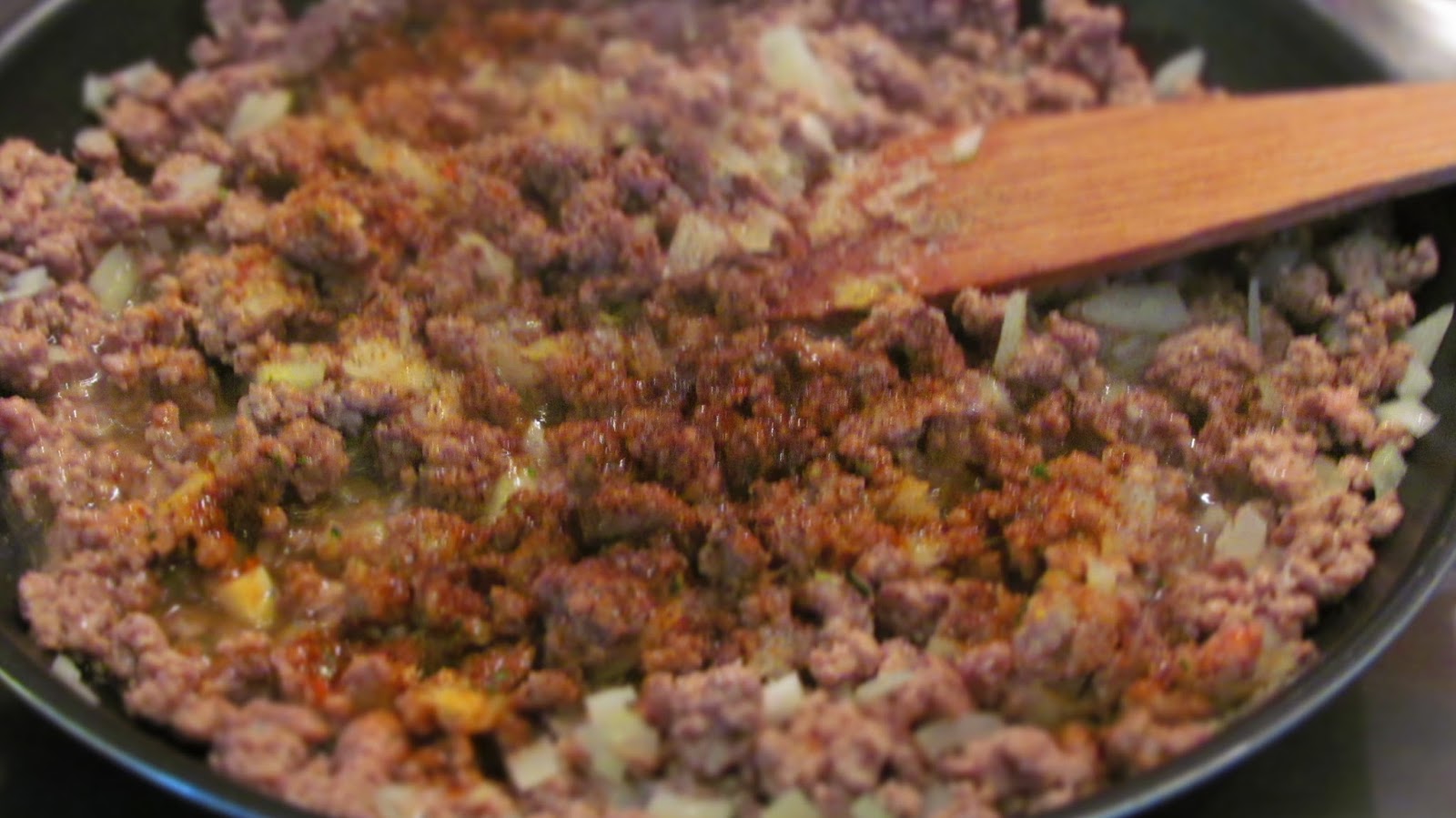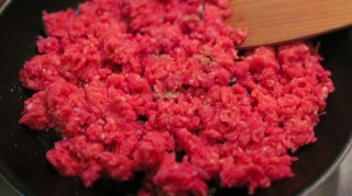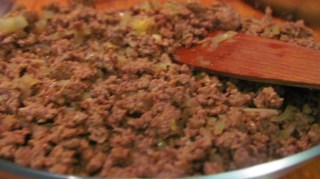 • Загрявам в тиган олиото и изпържвам каймата до отделянето й на трохи, като разбърквам непрекъснато с дървена лъжица.