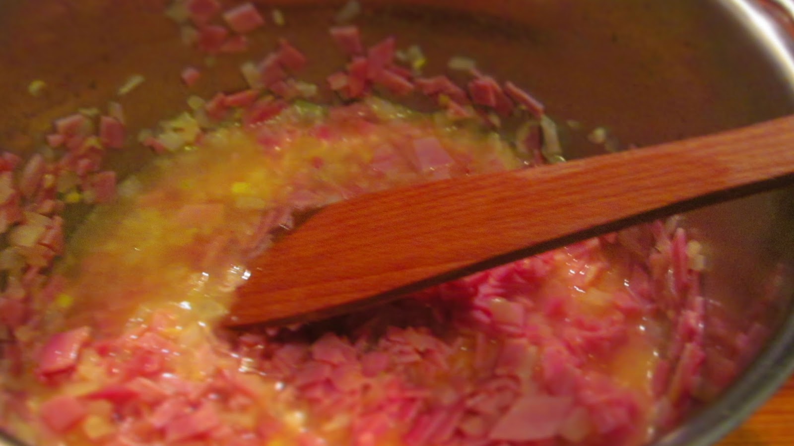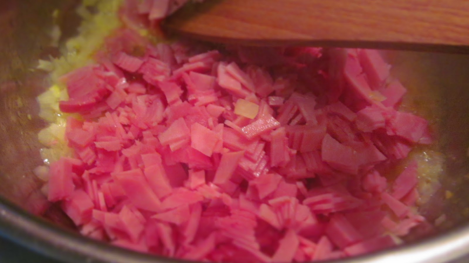 - Към омекналия лук добавям нарязаната на малки кубчета шунка.