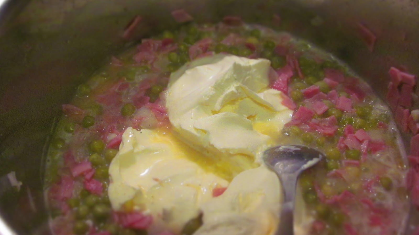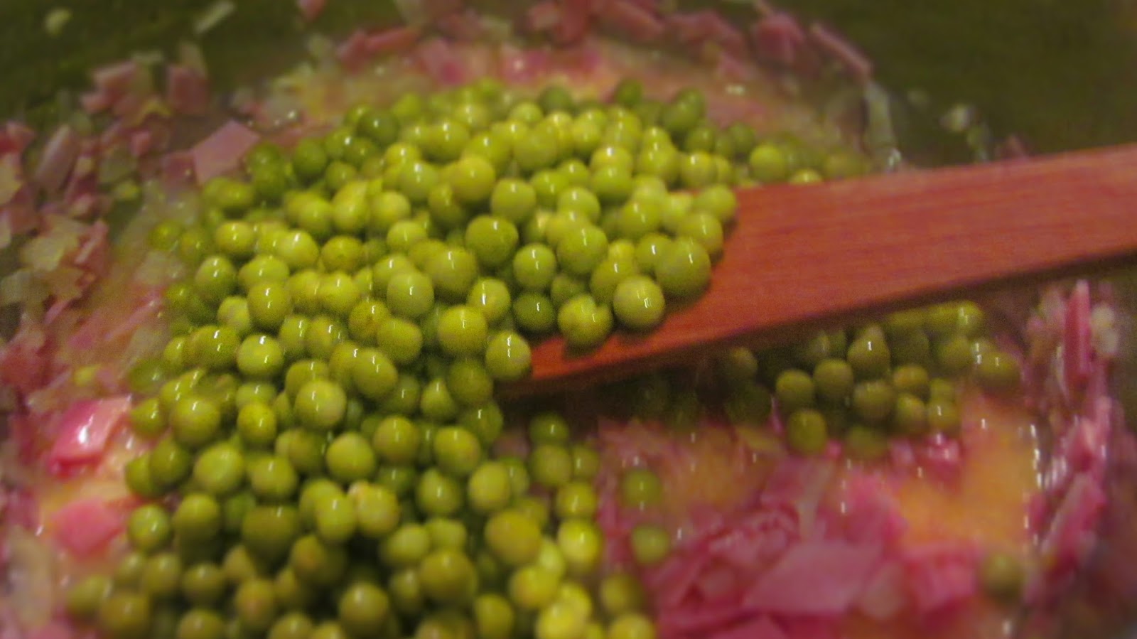 - Добавям предварително прецедения грах, разбърквам и оставям на слаб котлон за около 3 минути да поври.