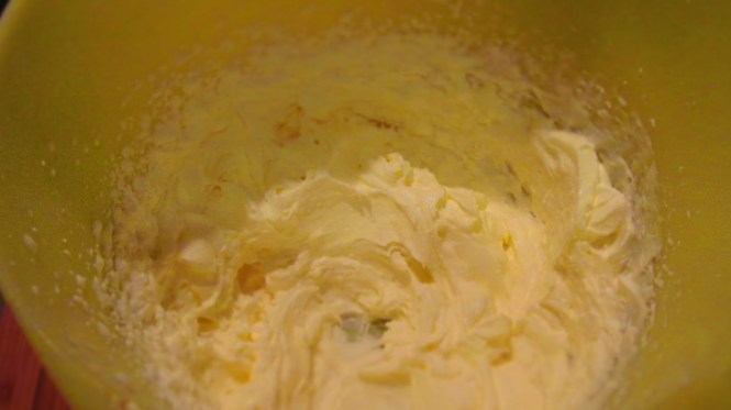 - Разбивам 200 мл сметана с пак. втвърдител, с. л. пудра захар и ванилия.