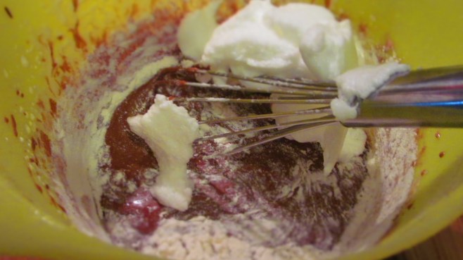 - Редувам с добавянето на белтъците. Разбъркването е много внимателно, за да не спаднат белтъците.