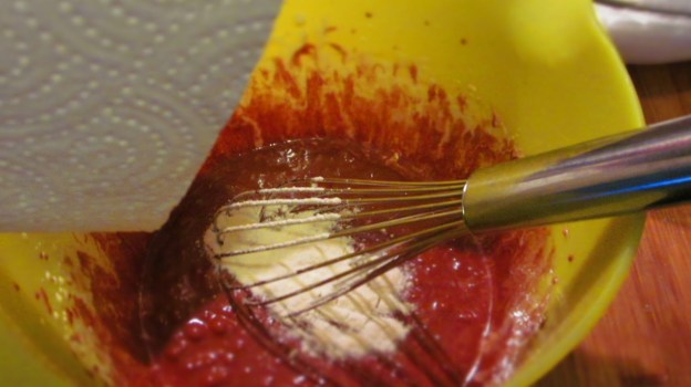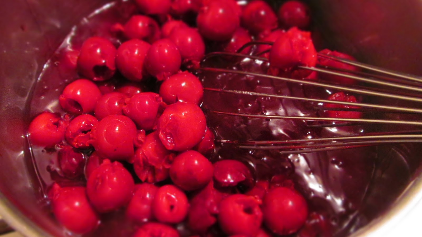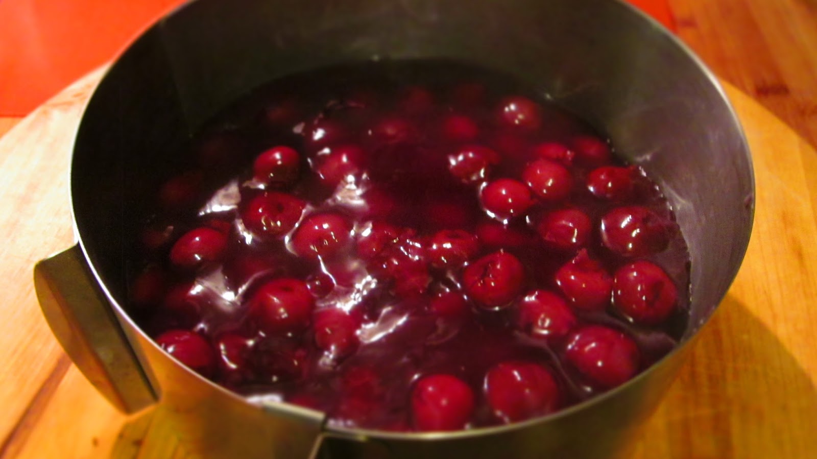 - Загрявам черешовия сок, добавям нишестето и с постоянно бъркане сварявам до сгъстяване.