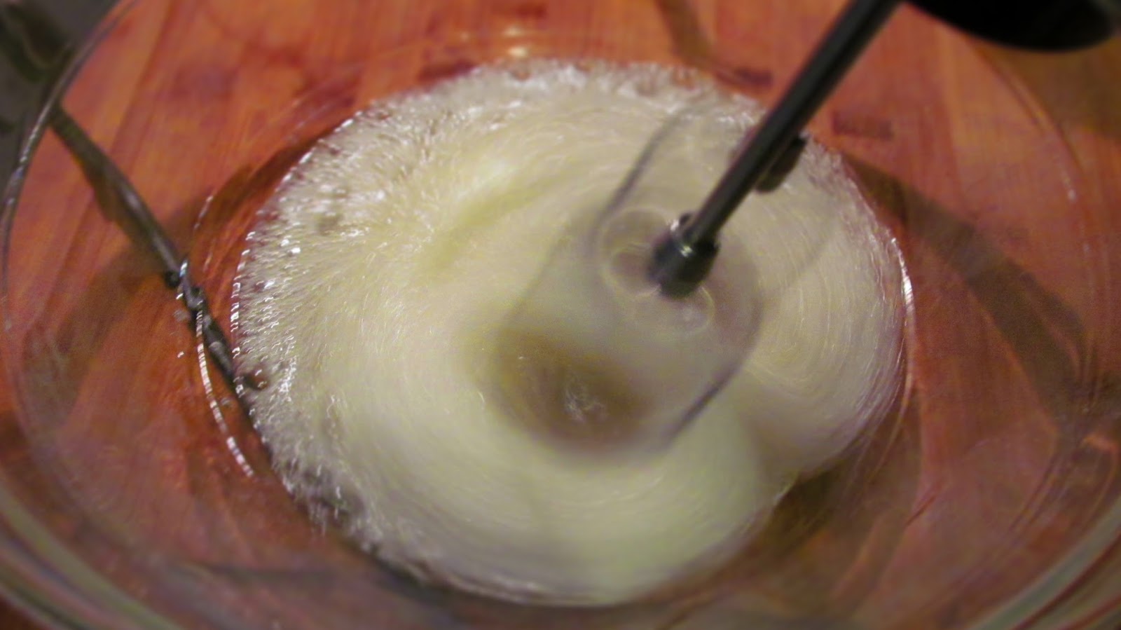- Разбивам за съвсем кратко белтъците на максимална мощност на миксера или само до като станат на пяна.
