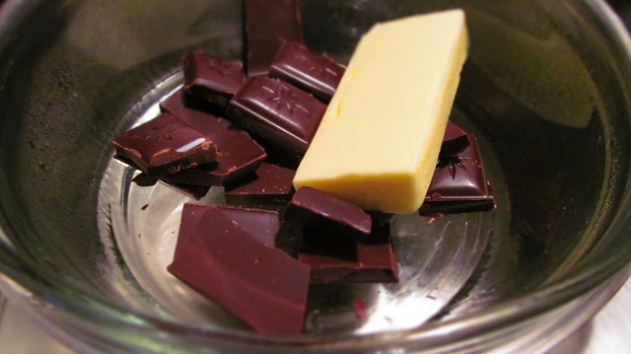 - Разтопявам шоколада на пара. В тенджерка сипвам студена вода, слагам стъклена купа върху нея, но да не се потопява във водата. Начупвам шоколада и добавям маслото. Включвам котлона и когато водата заври, изключвам. Шоколадът е разтопен. Нужно е само да се разбърка хубаво.