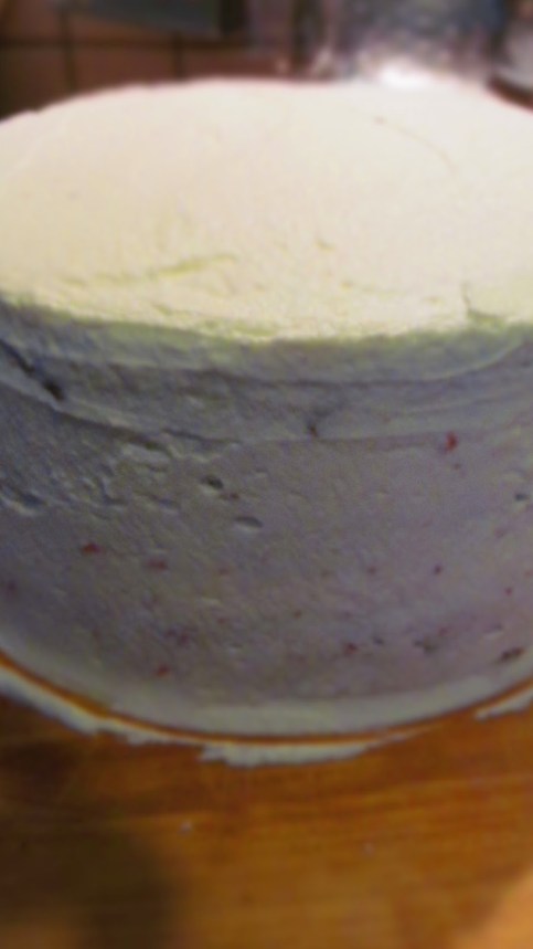 - Намазвам със сметаната тортата отгоре и отстрани. Заглаждам.