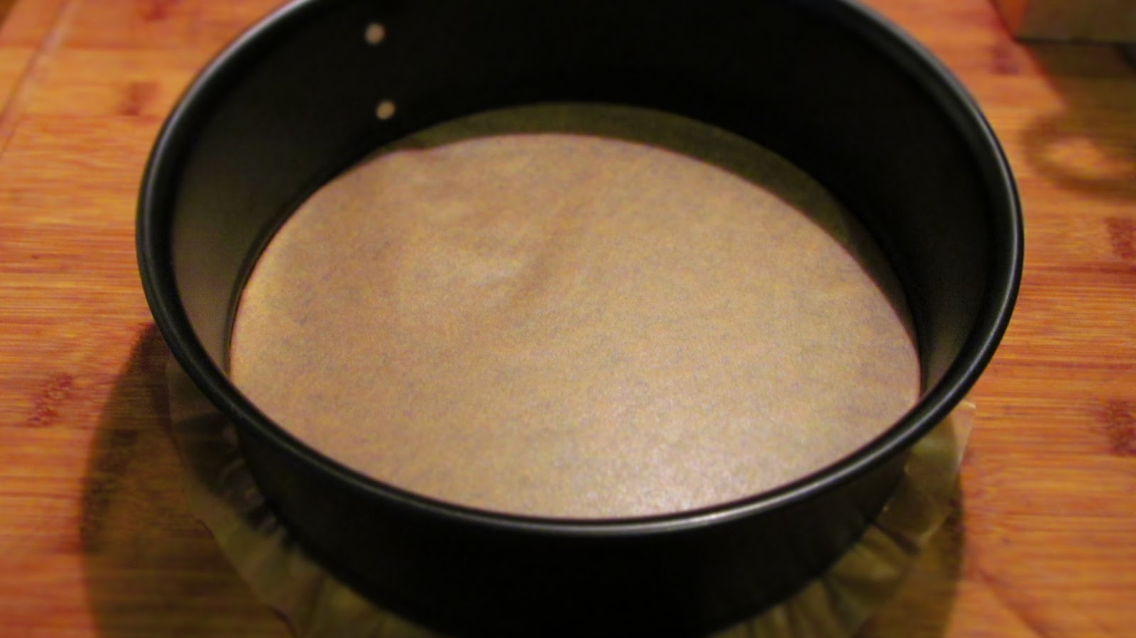 - Върху дъното на форма с размер 20 см в диаметър, постилам хартията за печене и чак тогава стягам със стените на формата. Излишната хартия изрязвам с ножица. Така приготвям в последните години блатове за торта. Само с хартия на дъното и без да намазвам формата с олио.