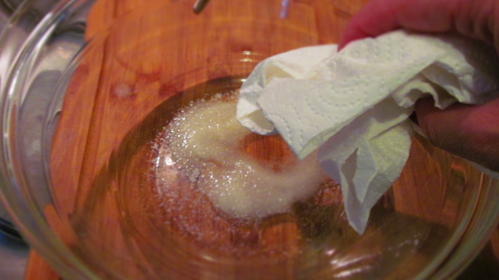 - В стъклена купа с кръгло дъно изсипвам 1 с. л. оцен и 1 с. л. сол. Изтриваме купата с домакинска хартия от оцета и солта, разнасяйки по цялата купа. Със същата хартия натърквам и накрайниците на миксера. Не изплаквам след това, защото остатъкът от оцета спомага за стягане на белтъците. В белтъците не трябва да има абсолютно никакъв жълтък.