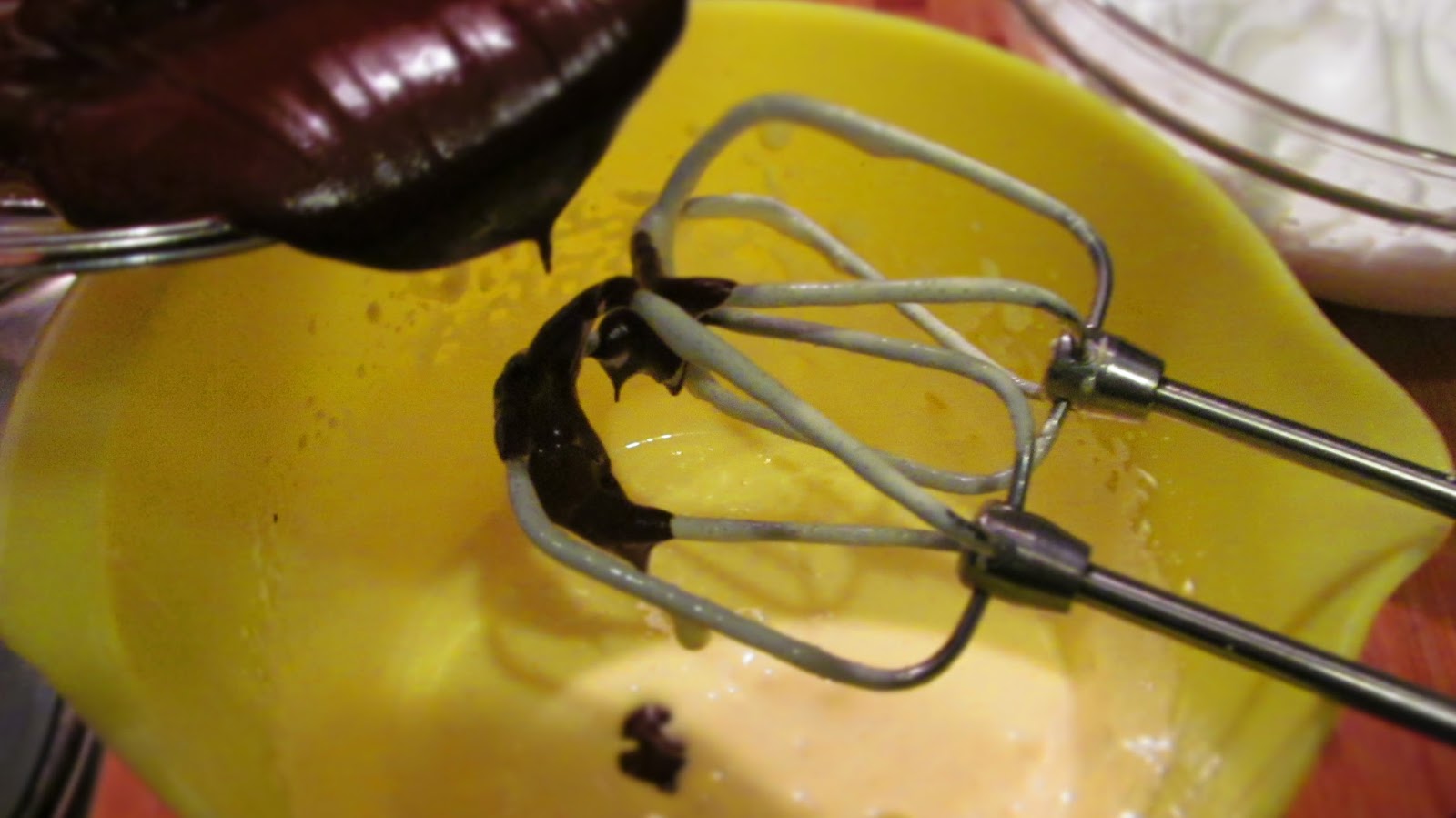 - Разбивам 200 мл сметана с пак. втвърдител, с. л. пудра захар и ванилията. Изсипвам 50 гр люспи черен шоколад и разбърквам леко със силиконова лопатка.