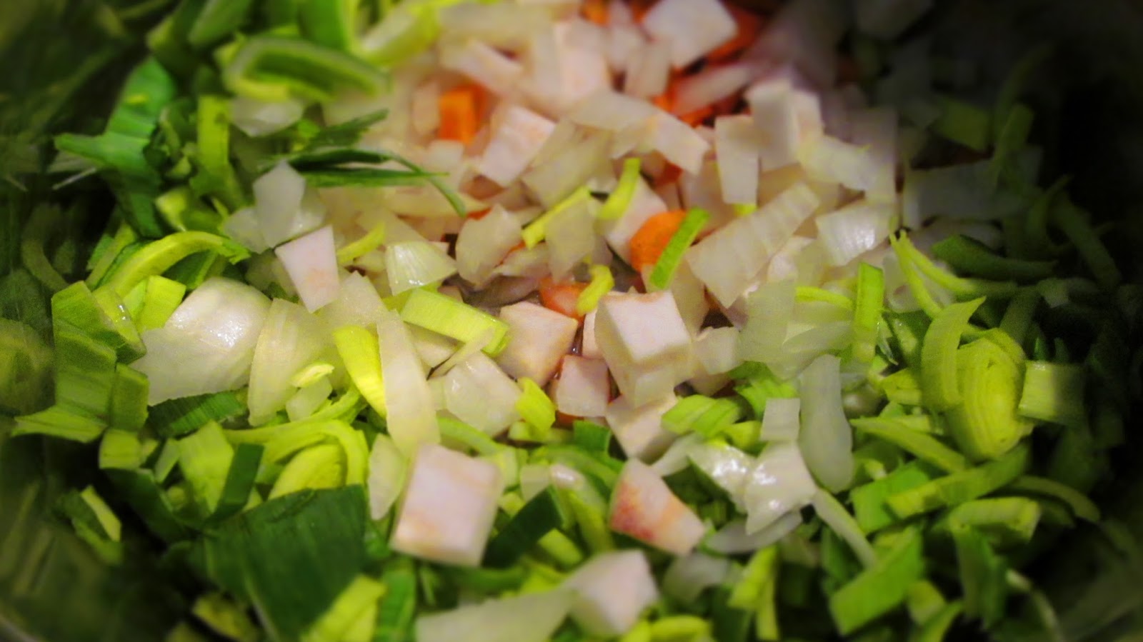 - В подходяща тенджера сипвам олиото, нарязаните на кубчета кромид лук, морков, целина и чесън. Нарязаният на кръгчета праз лук също. Изпържвам зеленчуците за кратко.