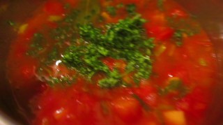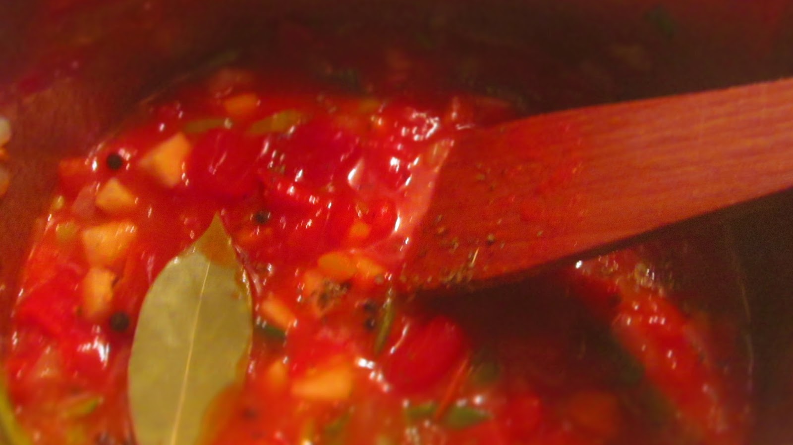- Добавям доматите, доматеното пюре, дафиновия лист и зърната черен пипер. Намалявам котлона и оставям за около 15 минути да къкри соса.