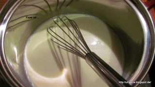 - Добавям на тънка струйка разтворения пудинг и бъркам непрекъснато, а котлона изключвам.