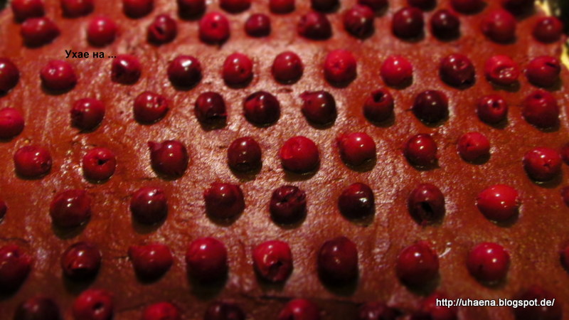 - Подреждам изцедените череши върху какаовото тесто, но не ги натискам. Те си потъват по време на изпичането.