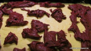 - Сипвам кафявото тесто с лъжица на различни места върху бялото тесто. Кафявото тесто също е доста гъсто.
