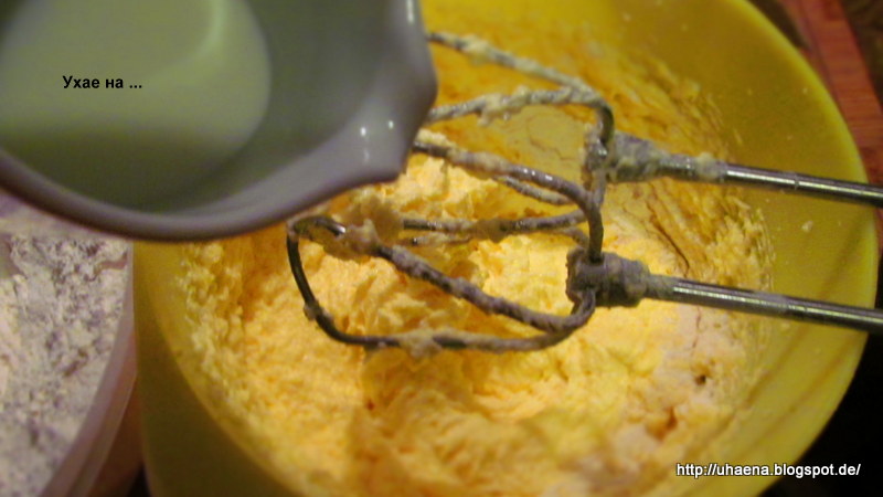 - Добавям на няколко пъти брашното, като редувам с 3 с. л. прясно мляко и бъркам непрекъснато с миксера.