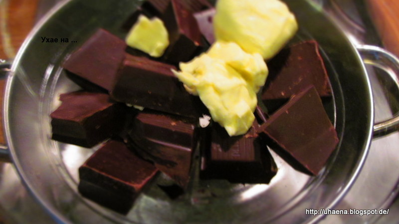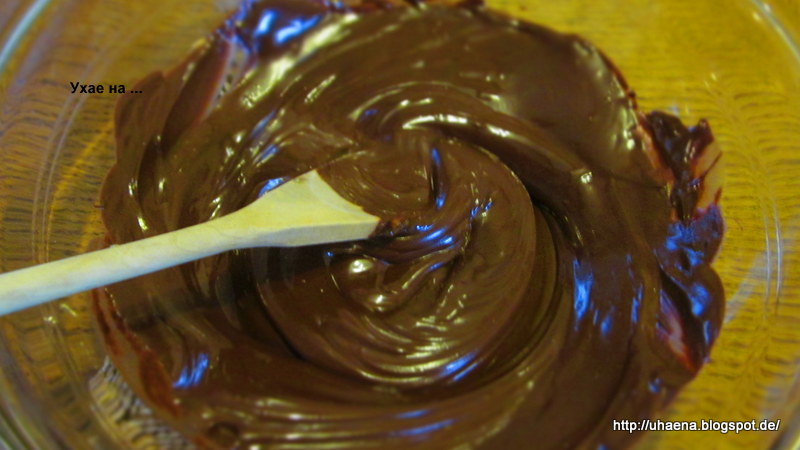 - На другия ден разтопявам шоколада на пара, заедно с 30 гр масло. В тенджера слагам студена вода. В стъклена купа начупвам шоколада и добавям маслото. Водата в тенджерата не трябва да опира в дъното на купата. Слагам на котлона. Бъркам от време на време с дървена лъжица. Когато водата заври шоколадът е разтопен.