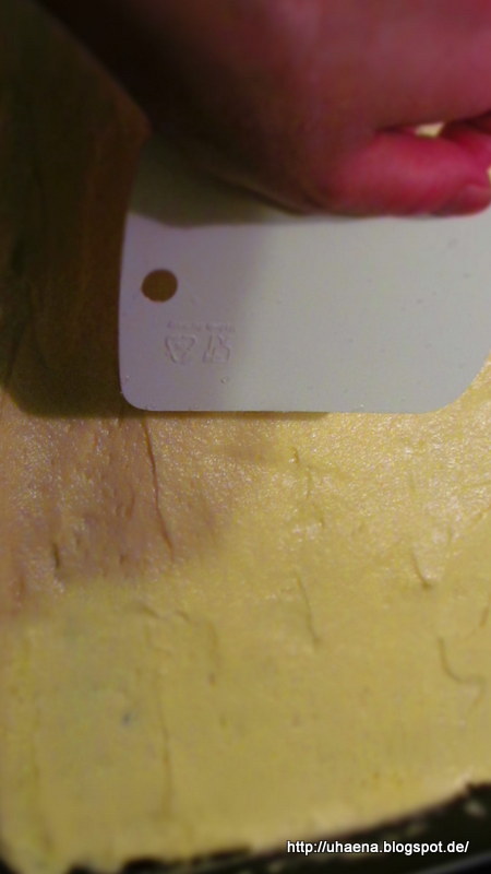 - В намазаната с олио тавичка разстилам бялата част от тестото. Не се притеснявайте, ако тестото Ви е доста гъсто. Така трябва да е. Малко по-гъсто е от кексовото тесто.