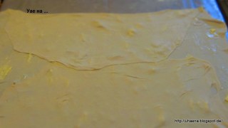 - Сгъвам от лявата страна и от дясната страна, но също само до средата на кората. Краищата да не се прехлупват. Намазвам с мас.