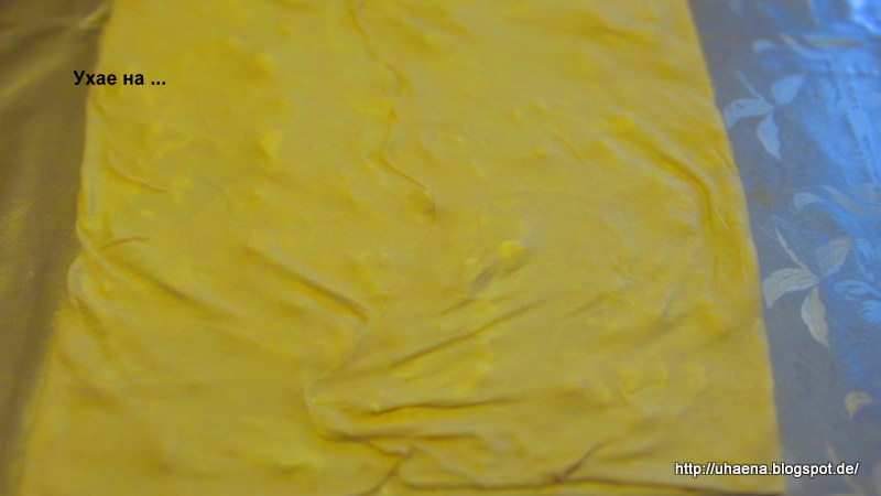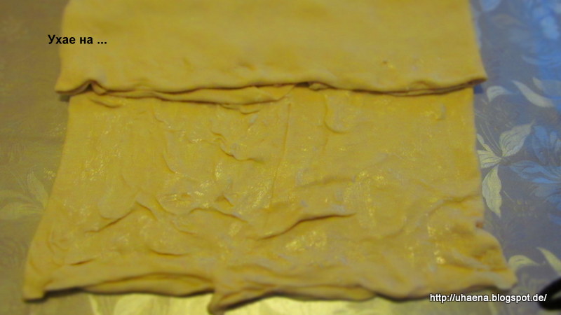- Сгъвам от лявата страна и от дясната страна, но също само до средата на кората. Краищата да не се прехлупват. Намазвам с мас.