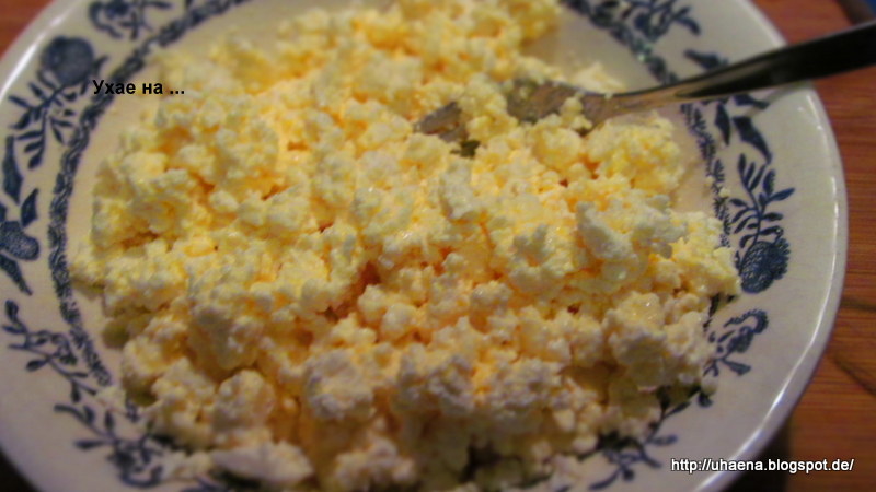 - Разбивам едното яйце и натрошавам сиренето. Разбърквам.