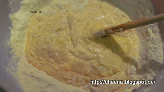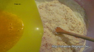 - Добавям яйчената смес към шупналата мая и запозвам малко по малко да добавям от брашното. Бъркам винаги с дървена лъжица.
