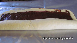 - Намазвам кората обилно с течен шоколад, като оставям от всички страни около 1,5 см свободни от шоколад.