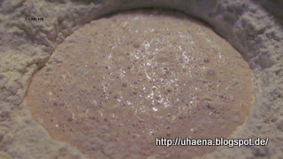 - Изсипвам разтворената мая в кладенчето и добавям съвсем малко от брашното към маята, колкото леко да се сгъсти млякото.