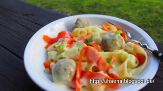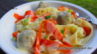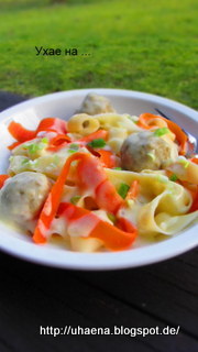 • В подходяща чиния слагам от морковите, фетучините, кюфтенцата и заливам с вкусния сос.