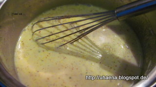 • Разбърквам соса с тел за разбиване, подправям със сол, черен пипер и индийско орехче и слагам на слаб котлон докато се стопли и леко сгъсти.