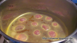 • Загрявам телешкия бульон и пускам в него кюфтенцата, като котлонът трябва да е на минимална степен на мощност. Кюфтенцата трябва само да се киснат в горещия бульон, но не и да врат. Има опасност да се разпаднат. Оставят се на котлона за около 20 минути.