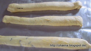 - Трите рула оплитам на плитка и пренасям върху тава, покрита с хартия за печене.